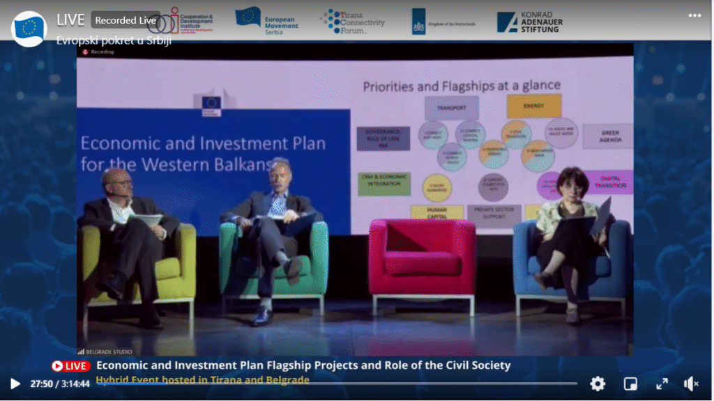 “Investicije na Zapadnom Balkanu treba da budu u skladu sa standardim EU, a situacija u regionu zahteva veću transparentnost u tim aktivnostima”, rekla je Krisela Hakaj na otvaranju onlajn konferencije Evropskog pokreta u Srbiji i Instituta za saradnju i razvoj na temu “Vodeći projekti ekonomskog i investicionog plana i uloga civilnog društva”.