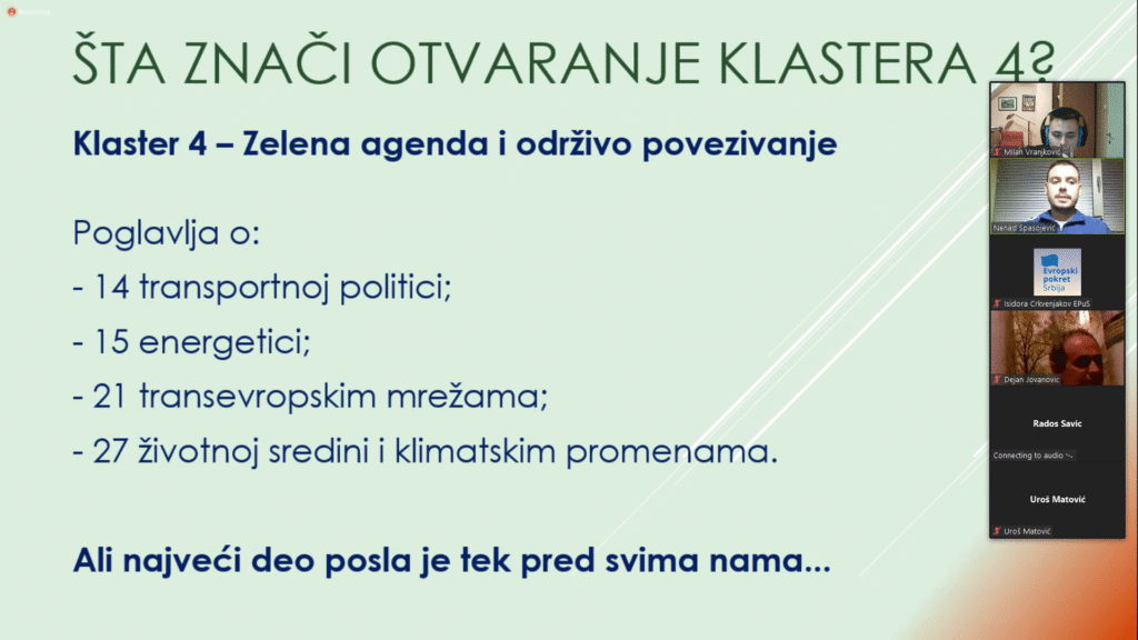 U uvodnom delu diskusije, Nenad Spasojević, ekspert iz Centra za kreiranje politika i strategija, rekao da je i pored otvaranja Klastera četiri u pristupnim pregovorima sa EU, koji obuhvata zelenu agendu, Srbiju čeka obiman posao.
