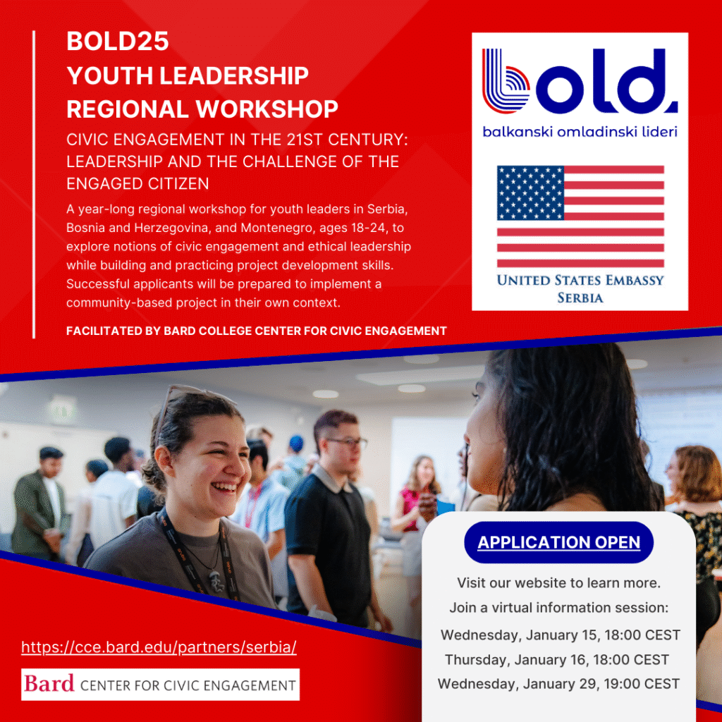 Bard College, u saradnji sa Američkom ambasadom u Srbiji, prihvata prijave za jednogodišnju regionalnu radionicu za mlade koja se fokusira na Građanski angažman u 21. veku: Liderstvo i izazovi angažovanog građanina.