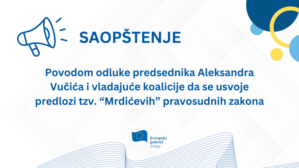 Evropski pokret u Srbiji najoštrije osuđuje odluku predsednika Aleksandra Vučića i vladajuće koalicije da se usvoje predlozi tzv. „Mrdićevih“ pravosudnih zakona koji predstavljaju neskriveni pokušaj izvršne vlasti da, nakon ustavnih promena, ponovo stave pod kontrolu srpsko pravosuđe. Ova odluka je nedostojna civilizovane evropske države u 21. veku. Neprihvatljivo je da su ovi u načelu „sistemski zakoni“ – koji imaju širok i dugoročan efekt na organizaciju pravosuđa pa time i na državu i društvo – usvojeni po hitnom posupku, kršeći propisane procedure, bez javne debate, nasuprot potivljenja i kritika stručne javnosti, uključujući predstavnike sudova, tužilaštva i organizacija civilnog društva, kao i uz ignorisanje procedure konsultacija sa predstavnicima Evropske komisije i Venecijanske komisije.