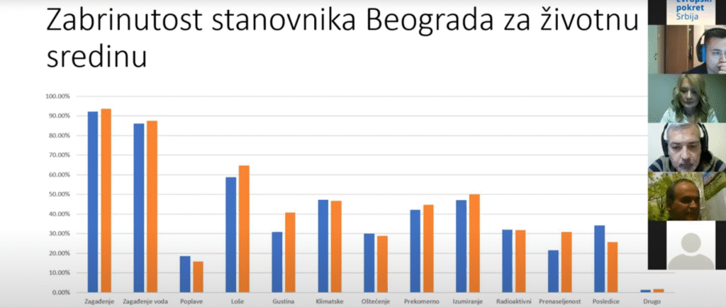 U uvodnom delu sastanka, projektni asistent Evropskog Pokreta u Srbiji Milan Vranjković ukratko je prezentovao projekat „Zelena agenda na lokalnom nivou“ i anketno istraživanje „Šta građani i građanke misle o klimatskim promenama“. Anketno istraživanje pokazalo je da najveći broj ispitanika brine zagađenje vazduha i voda u Beogradu, kao i da su uzrok toga aktivnosti privrede, industrije i loše upravljanje otpadom.