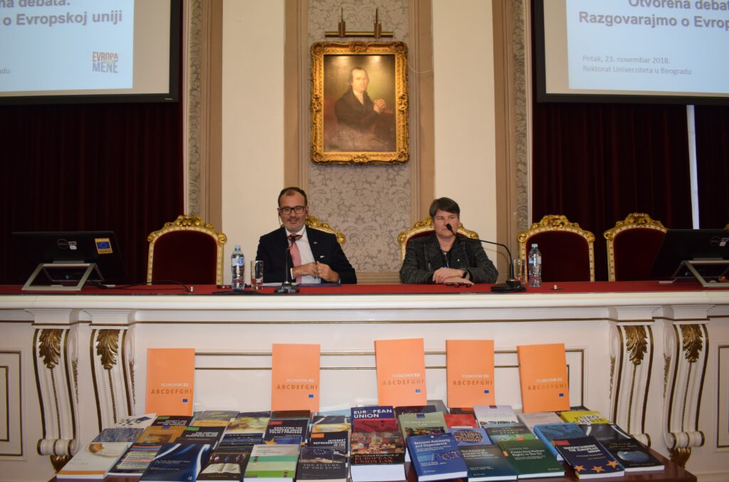 Šef Delegacije Evropske unije u Srbiji Sem Fabrici i rektorka Univerziteta u Beogradu Ivanka Popović razgovarali su 23. novembra sa studentima, profesorima, predstavnicima istraživačke zajednice i nevladinog sektora o aktuelnim dešavanjima u EU i njenim odnosima sa Srbijom.